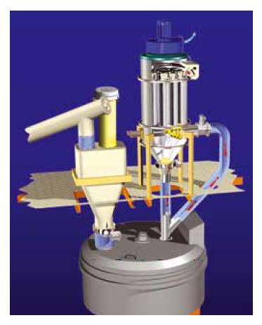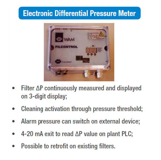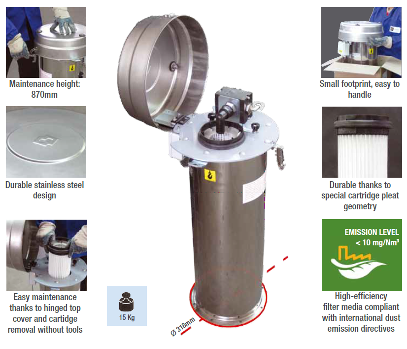 Dust which is separated from the air flow by a single patented WAM® cartridge filter element drops back into the hopper after an integrated automatic reverse air jet cleaning system inside the