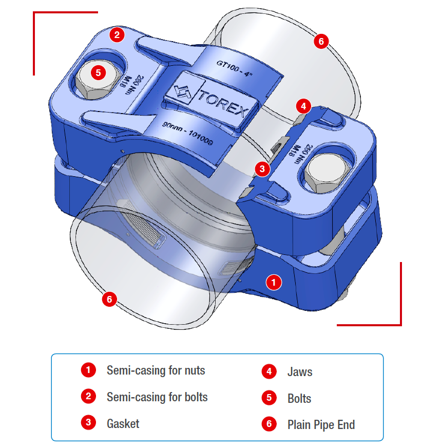 GT Couplings join up two plain pipe ends on the same horizontal axis in a safe, quick and rigid way. The jaws integrated in the casing assure a solid grip and prevent the pipes from being pulled out.